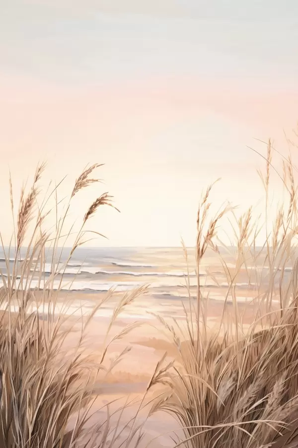 Affiche Herbe de la pampa avec une palette de couleurs orange pastel, un ciel rose pâle, un paysage paisible f45935