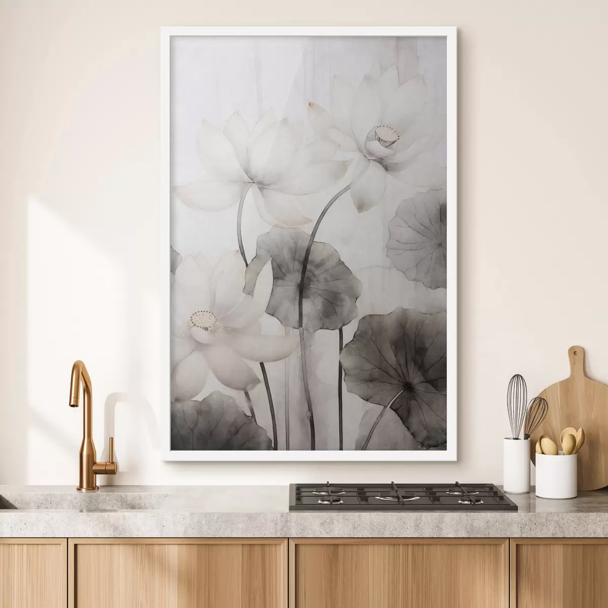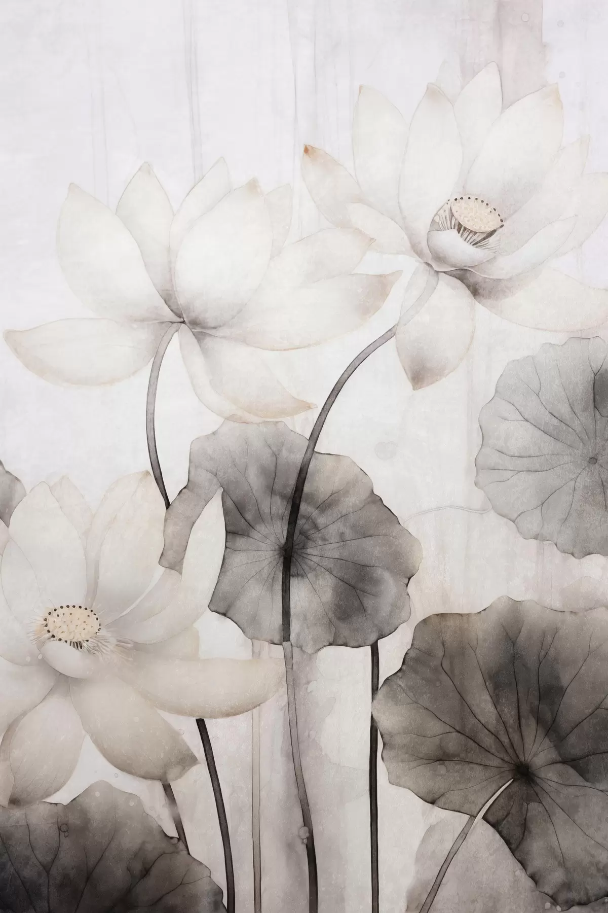 Affiche Fleurs de lotus blanches texturées avec des feuilles foncées, fond clair, design minimaliste f45937