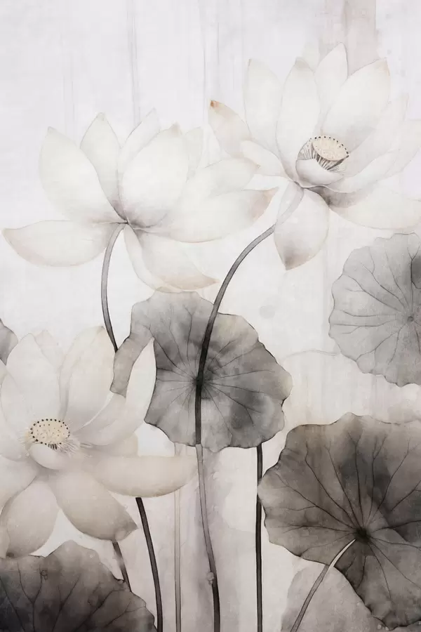Affiche Fleurs de lotus blanches texturées avec des feuilles foncées, fond clair, design minimaliste f45937