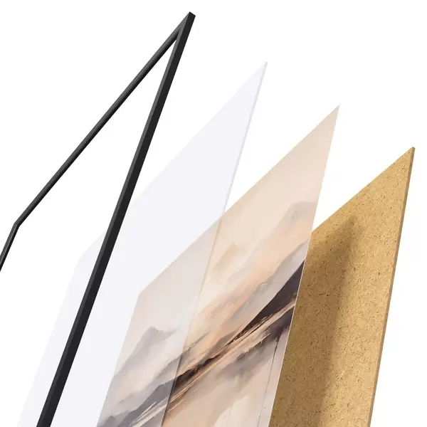 Le poster se compose d'un cadre, d'un plexiglas, d'une image imprimée et d'un support en aggloméré. Le poster peut être immédiatement accroché au mur grâce aux fixations au dos.