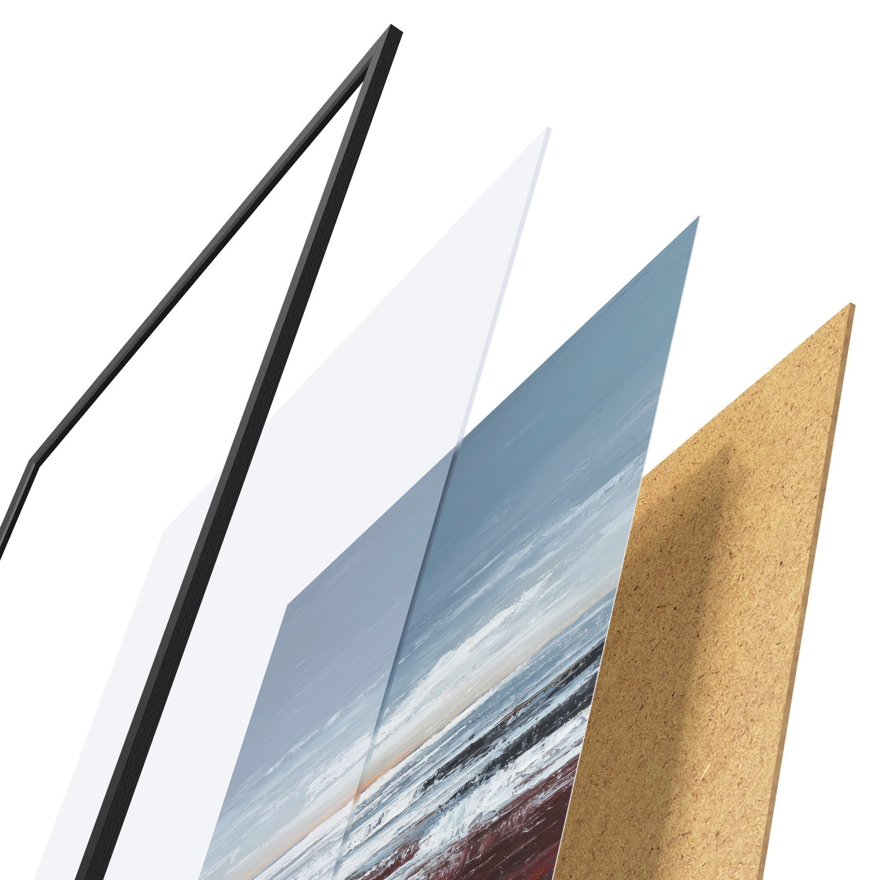 Le poster se compose d'un cadre, d'un plexiglas, d'une image imprimée et d'un support en aggloméré. Le poster peut être immédiatement accroché au mur grâce aux fixations au dos.