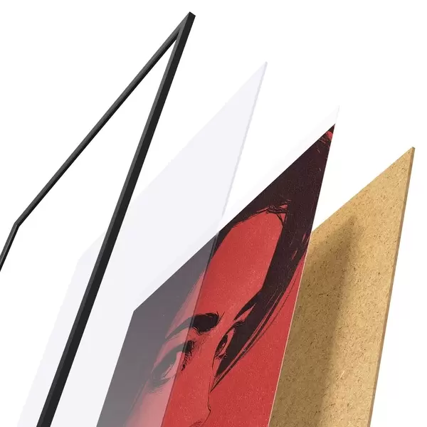 Le poster se compose d'un cadre, d'un plexiglas, d'une image imprimée et d'un support en aggloméré. Le poster peut être immédiatement accroché au mur grâce aux fixations au dos.