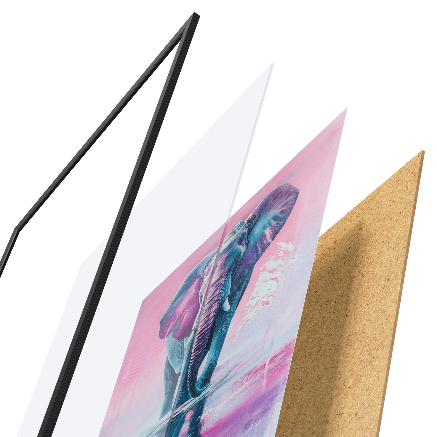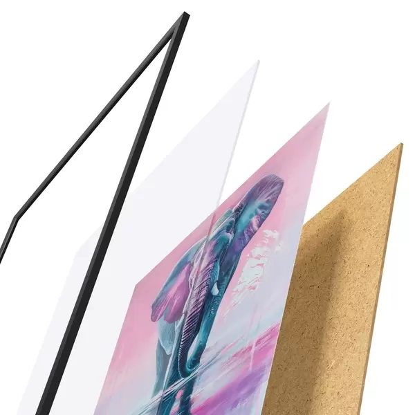 Le poster se compose d'un cadre, d'un plexiglas, d'une image imprimée et d'un support en aggloméré. Le poster peut être immédiatement accroché au mur grâce aux fixations au dos.