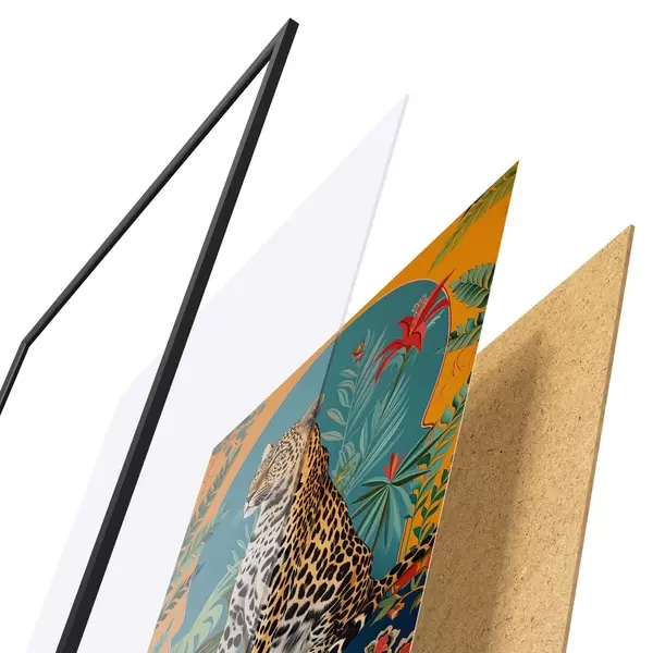 Le poster se compose d'un cadre, d'un plexiglas, d'une image imprimée et d'un support en aggloméré. Le poster peut être immédiatement accroché au mur grâce aux fixations au dos.