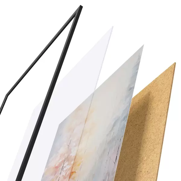 Le poster se compose d'un cadre, d'un plexiglas, d'une image imprimée et d'un support en aggloméré. Le poster peut être immédiatement accroché au mur grâce aux fixations au dos.