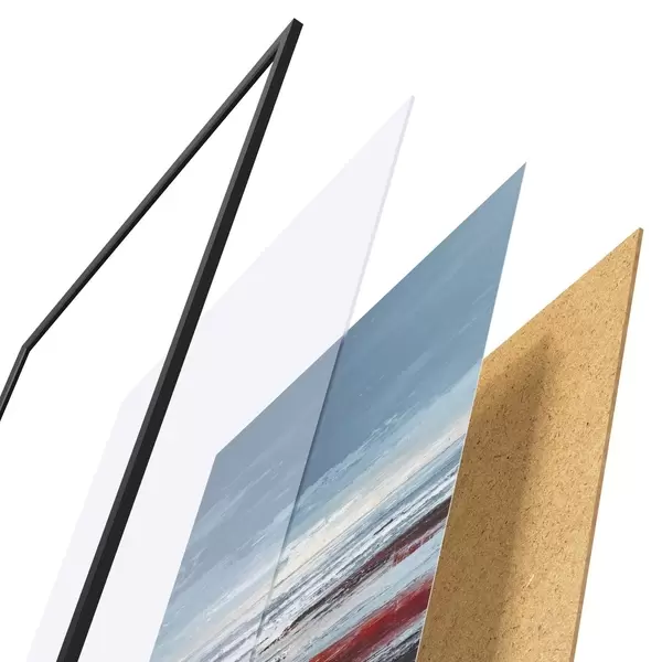 Le poster se compose d'un cadre, d'un plexiglas, d'une image imprimée et d'un support en aggloméré. Le poster peut être immédiatement accroché au mur grâce aux fixations au dos.