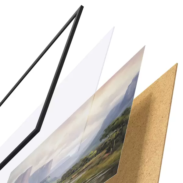 Le poster se compose d'un cadre, d'un plexiglas, d'une image imprimée et d'un support en aggloméré. Le poster peut être immédiatement accroché au mur grâce aux fixations au dos.