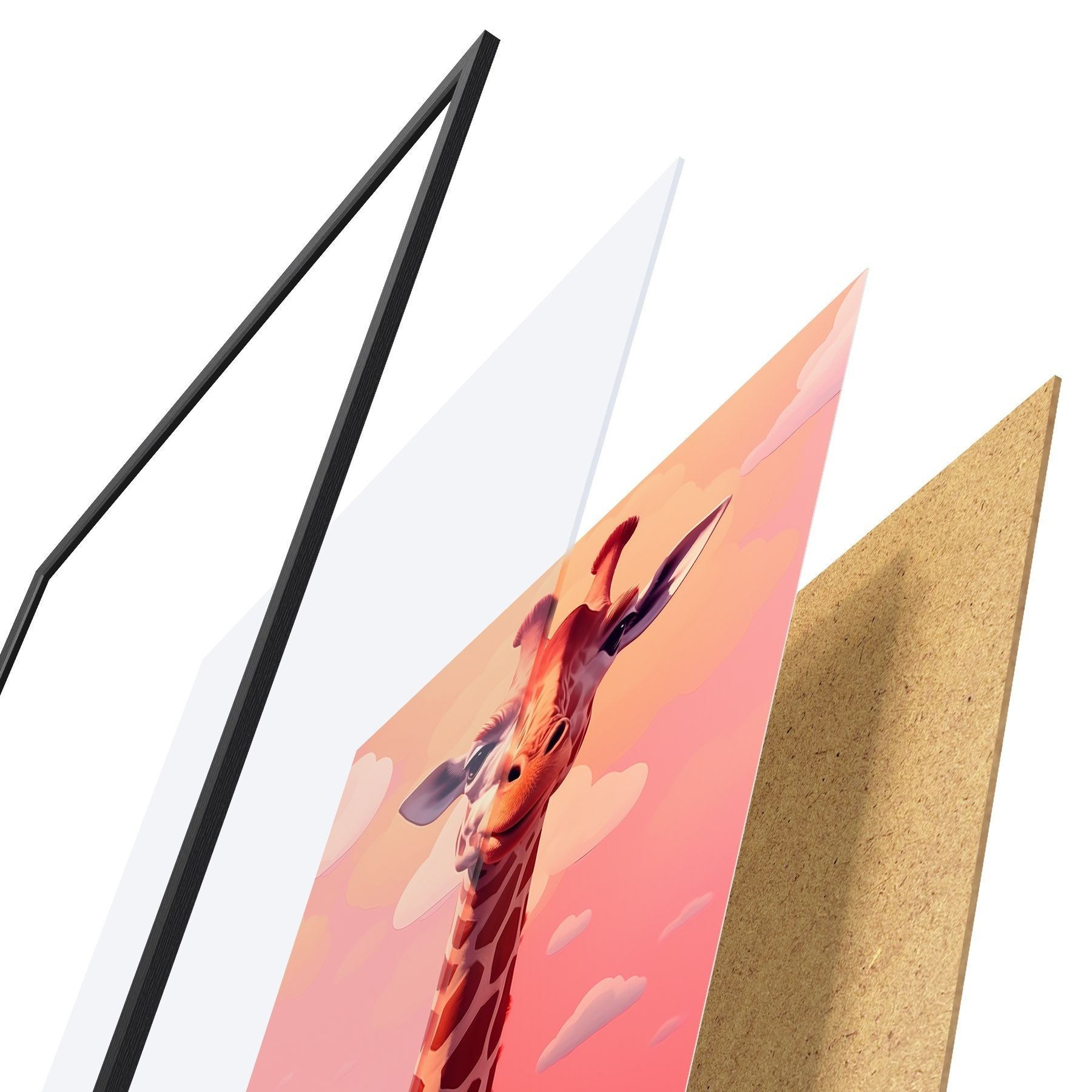 Le poster se compose d'un cadre, d'un plexiglas, d'une image imprimée et d'un support en aggloméré. Le poster peut être immédiatement accroché au mur grâce aux fixations au dos.