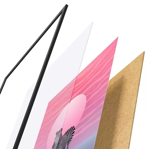 Le poster se compose d'un cadre, d'un plexiglas, d'une image imprimée et d'un support en aggloméré. Le poster peut être immédiatement accroché au mur grâce aux fixations au dos.