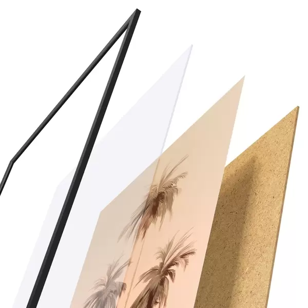 Le poster se compose d'un cadre, d'un plexiglas, d'une image imprimée et d'un support en aggloméré. Le poster peut être immédiatement accroché au mur grâce aux fixations au dos.