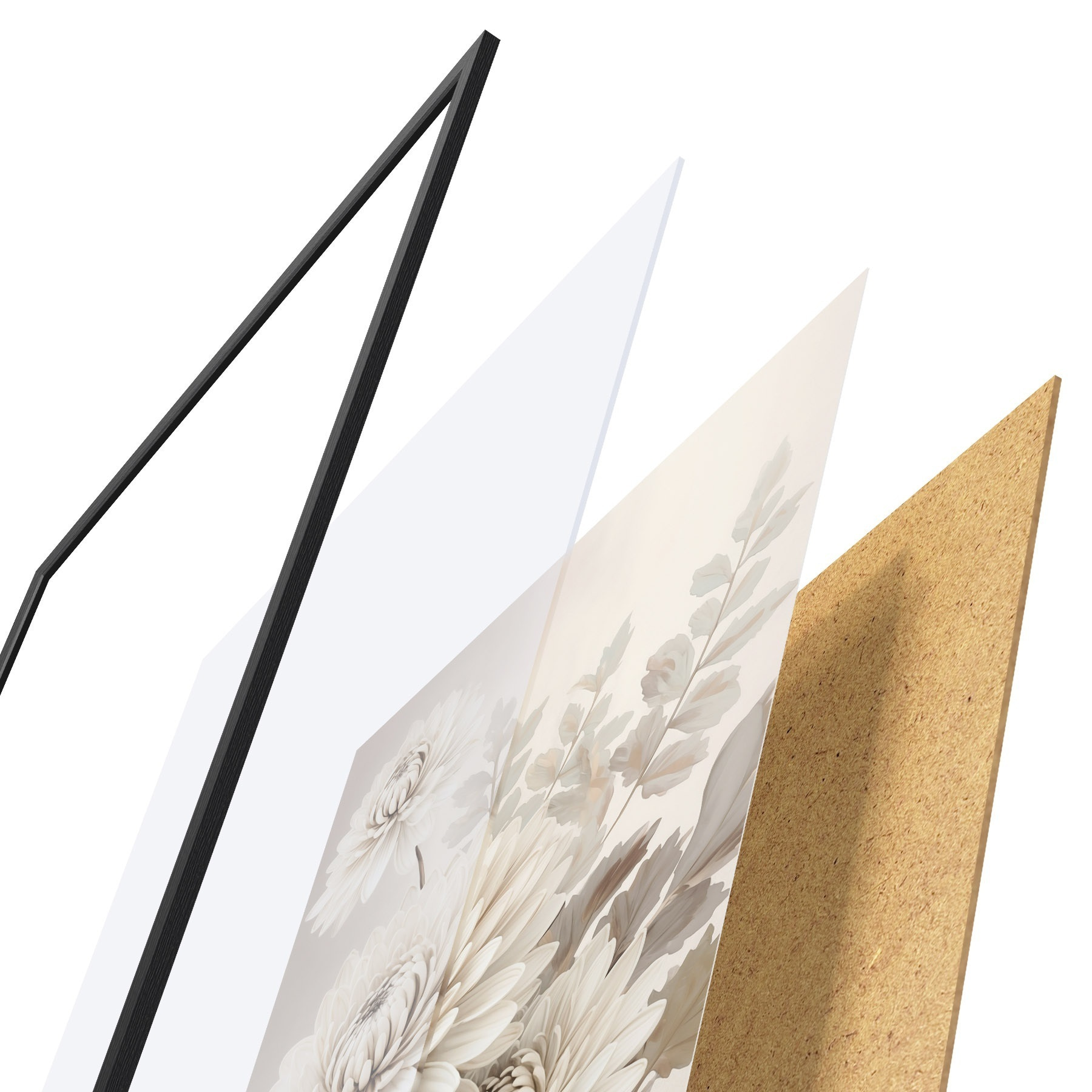 Le poster se compose d'un cadre, d'un plexiglas, d'une image imprimée et d'un support en aggloméré. Le poster peut être immédiatement accroché au mur grâce aux fixations au dos.