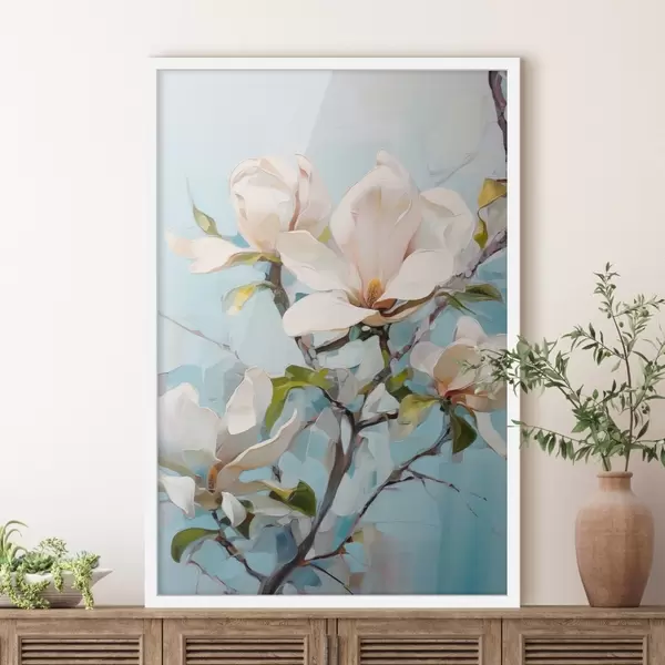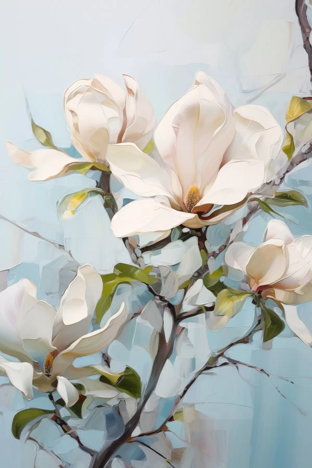 Affiche Fleurs de magnolia blanches, fond bleu clair avec des coups de pinceau doux, style peinture à l'huile, texture impasto f46277