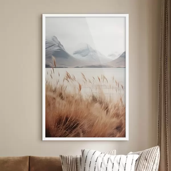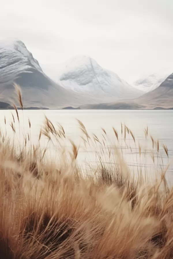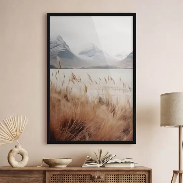 Affiche Champ d'herbes de la pampa devant un paysage lacustre avec des montagnes enneigées en arrière-plan, lumière douce Non f46282