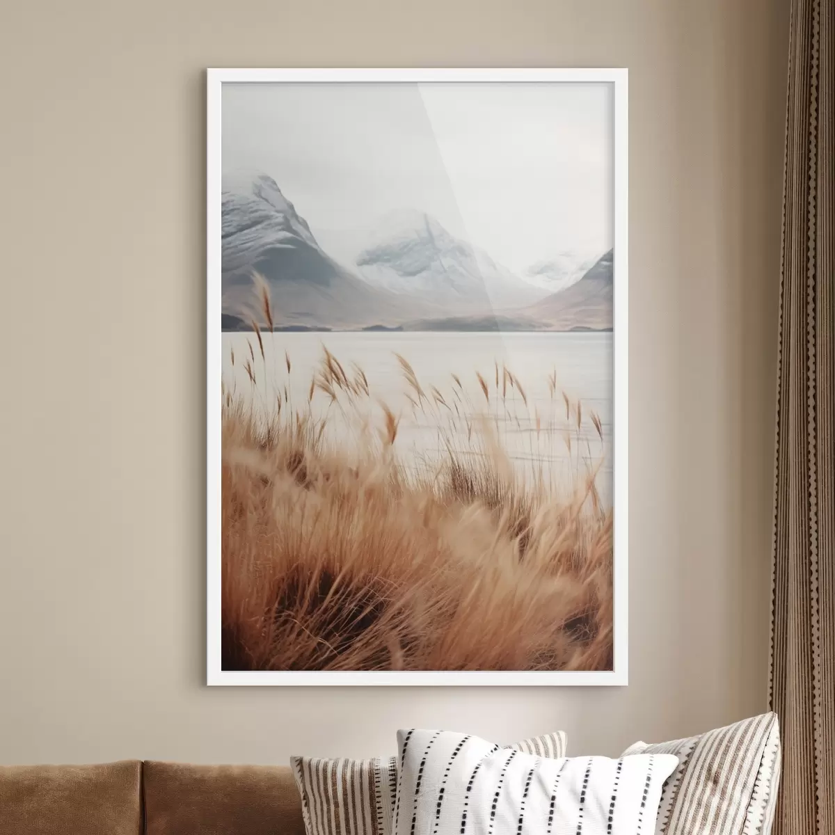 Affiche Champ d'herbes de la pampa devant un paysage lacustre avec des montagnes enneigées en arrière-plan, lumière douce f46282