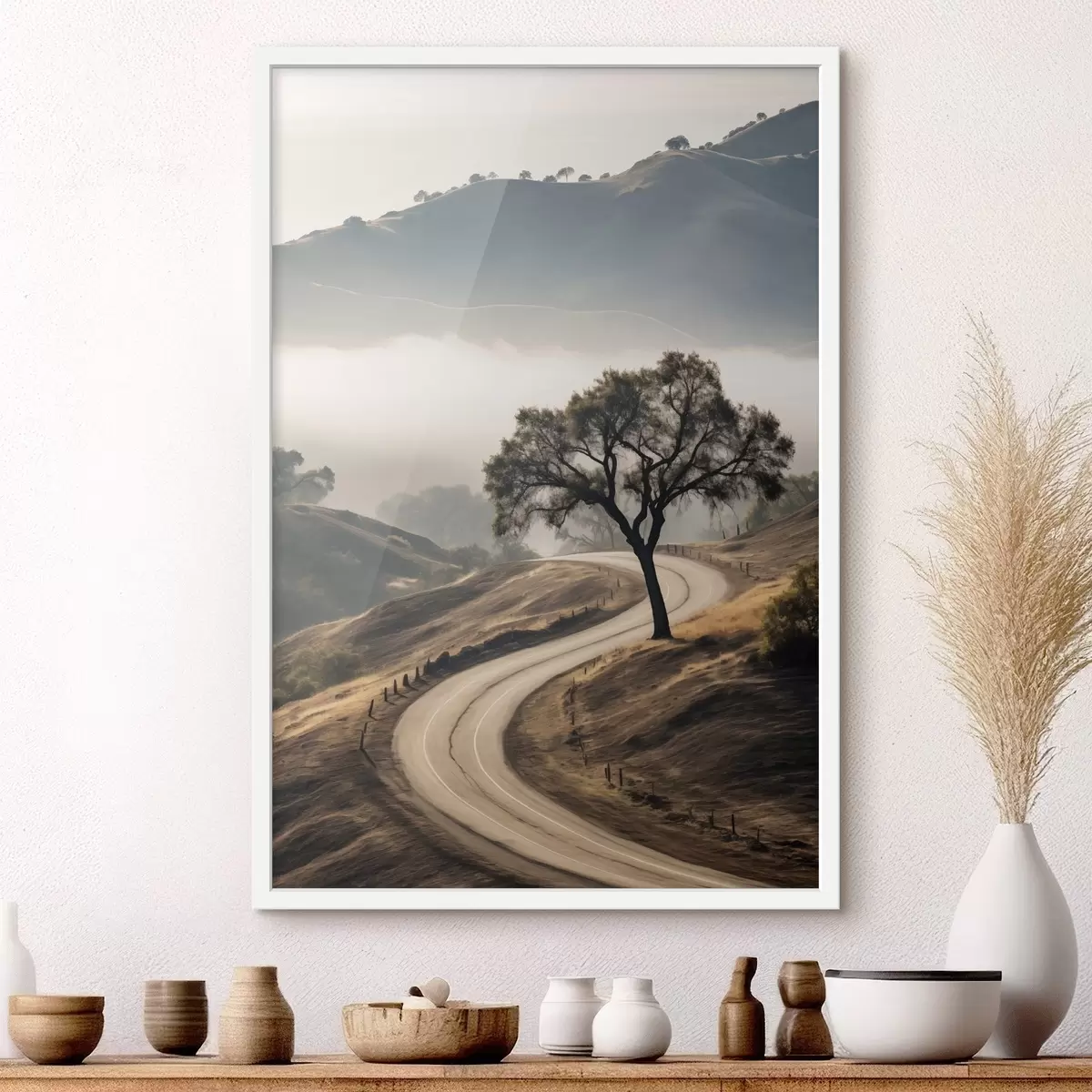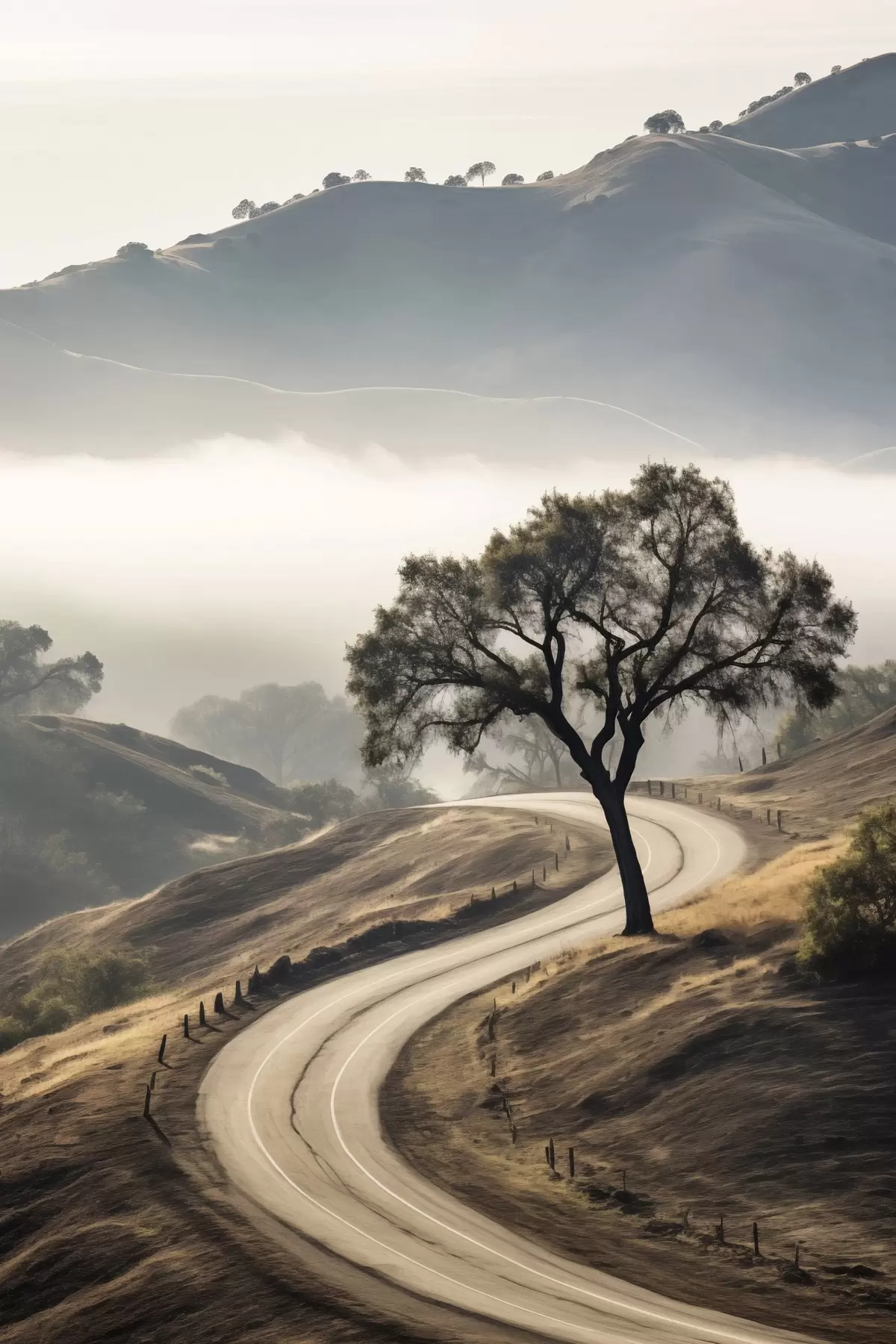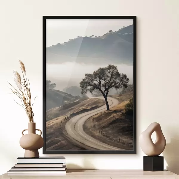Affiche Une route sinueuse à travers des collines vallonnées avec un arbre au premier plan, le fond avec du brouillard et des montagnes Non f46288