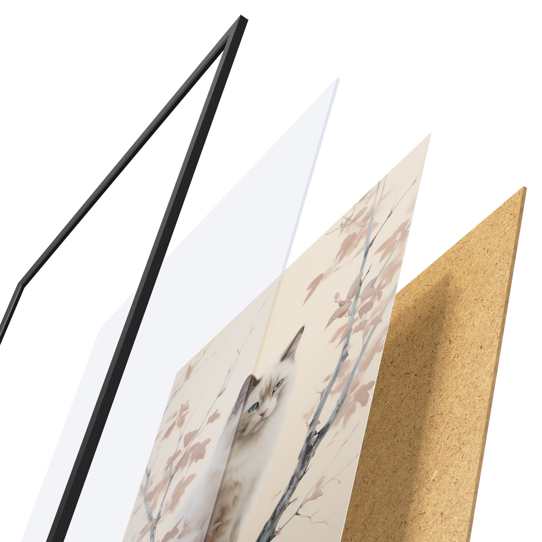 Le poster se compose d'un cadre, d'un plexiglas, d'une image imprimée et d'un support en aggloméré. Le poster peut être immédiatement accroché au mur grâce aux fixations au dos.