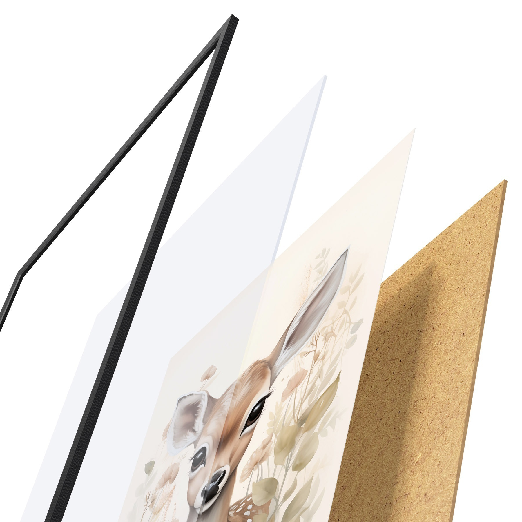 Le poster se compose d'un cadre, d'un plexiglas, d'une image imprimée et d'un support en aggloméré. Le poster peut être immédiatement accroché au mur grâce aux fixations au dos.