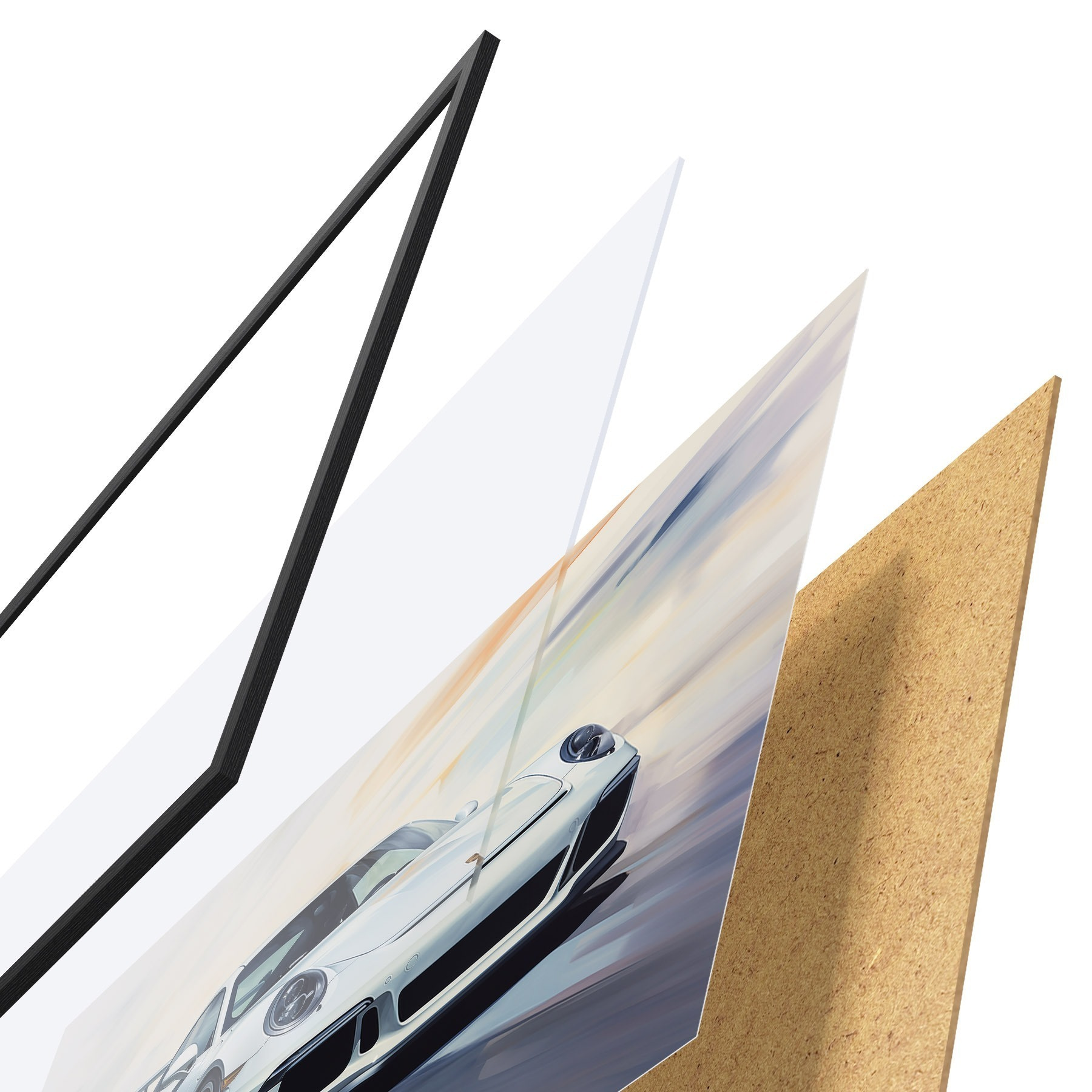 Le poster se compose d'un cadre, d'un plexiglas, d'une image imprimée et d'un support en aggloméré. Le poster peut être immédiatement accroché au mur grâce aux fixations au dos.
