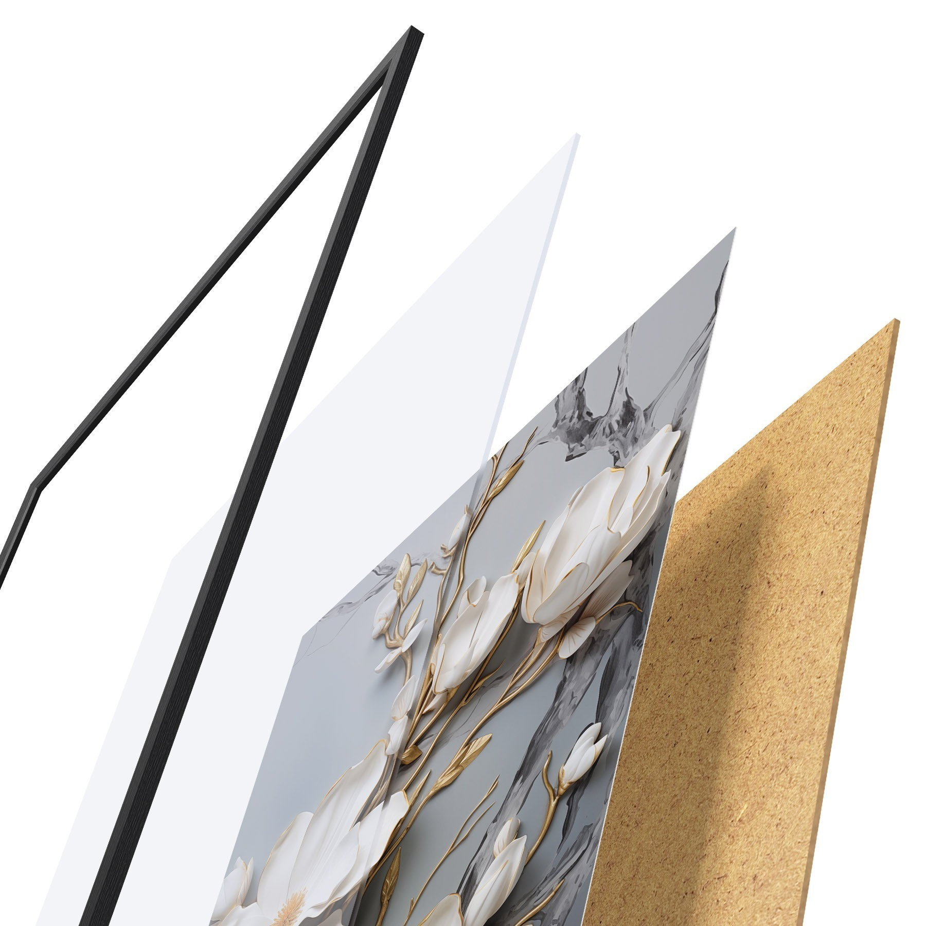 Le poster se compose d'un cadre, d'un plexiglas, d'une image imprimée et d'un support en aggloméré. Le poster peut être immédiatement accroché au mur grâce aux fixations au dos.