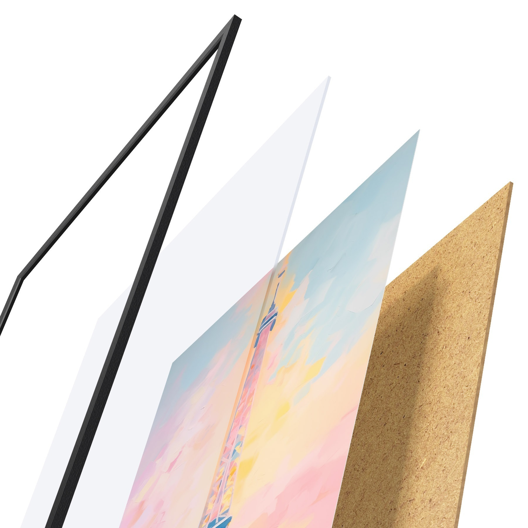 Le poster se compose d'un cadre, d'un plexiglas, d'une image imprimée et d'un support en aggloméré. Le poster peut être immédiatement accroché au mur grâce aux fixations au dos.