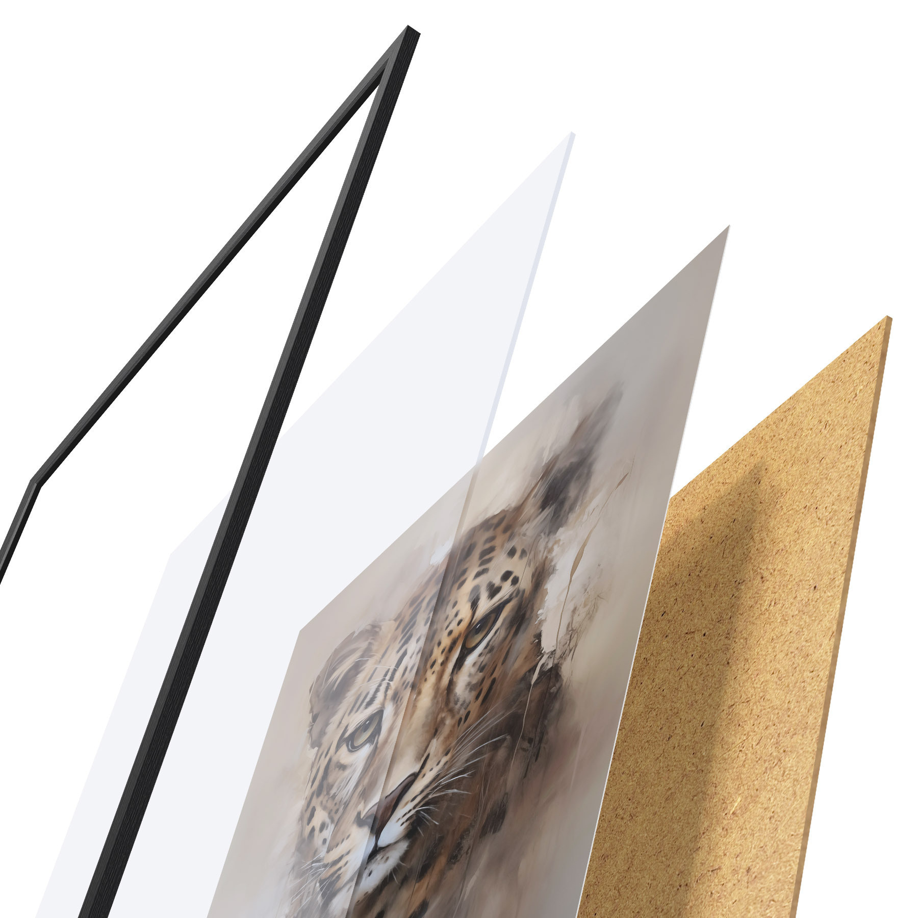 Le poster se compose d'un cadre, d'un plexiglas, d'une image imprimée et d'un support en aggloméré. Le poster peut être immédiatement accroché au mur grâce aux fixations au dos.