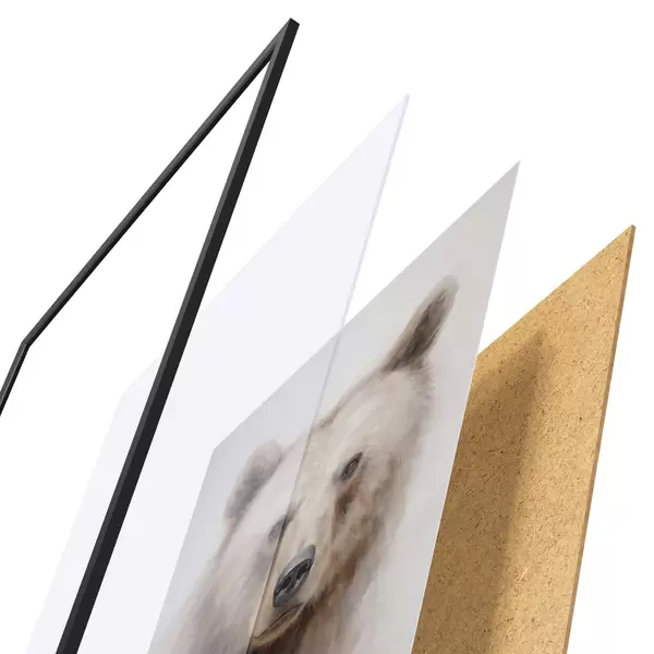 Le poster se compose d'un cadre, d'un plexiglas, d'une image imprimée et d'un support en aggloméré. Le poster peut être immédiatement accroché au mur grâce aux fixations au dos.