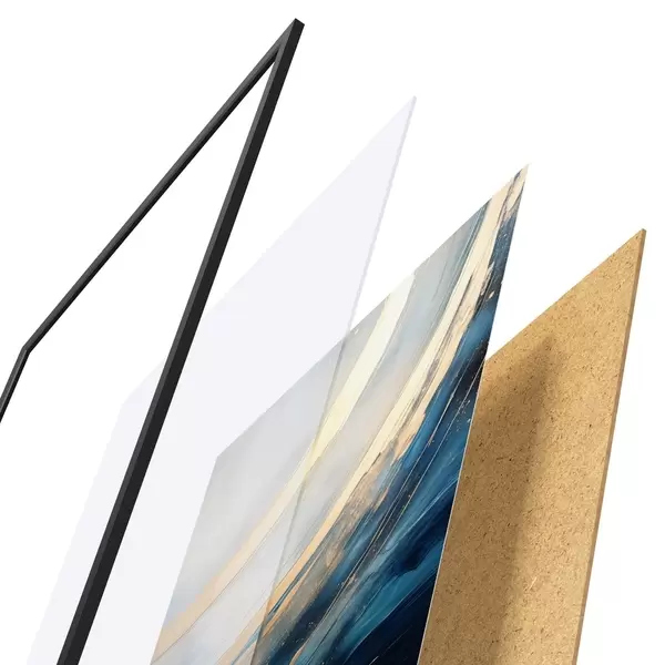 Le poster se compose d'un cadre, d'un plexiglas, d'une image imprimée et d'un support en aggloméré. Le poster peut être immédiatement accroché au mur grâce aux fixations au dos.