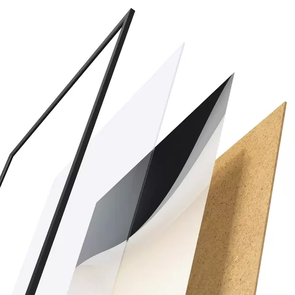 Le poster se compose d'un cadre, d'un plexiglas, d'une image imprimée et d'un support en aggloméré. Le poster peut être immédiatement accroché au mur grâce aux fixations au dos.