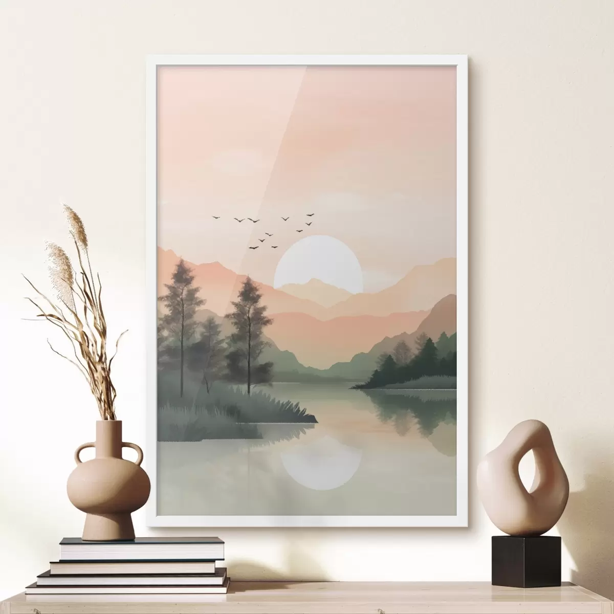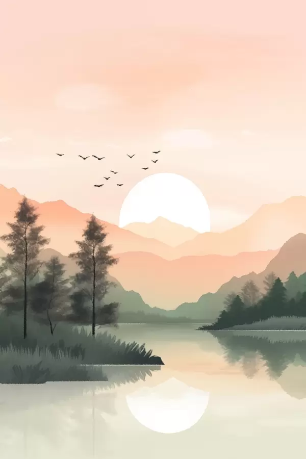 Affiche Coucher de soleil pastel sur un lac tranquille avec des collines lointaines et des oiseaux Non f46508