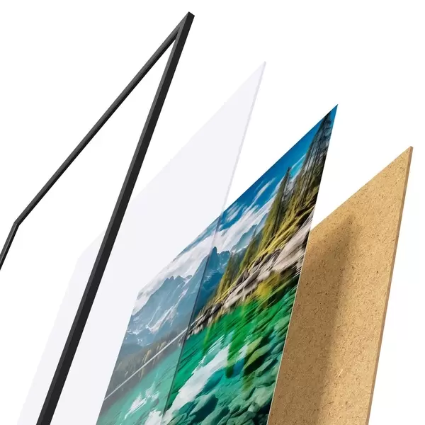 Le poster se compose d'un cadre, d'un plexiglas, d'une image imprimée et d'un support en aggloméré. Le poster peut être immédiatement accroché au mur grâce aux fixations au dos.
