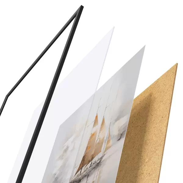 Le poster se compose d'un cadre, d'un plexiglas, d'une image imprimée et d'un support en aggloméré. Le poster peut être immédiatement accroché au mur grâce aux fixations au dos.