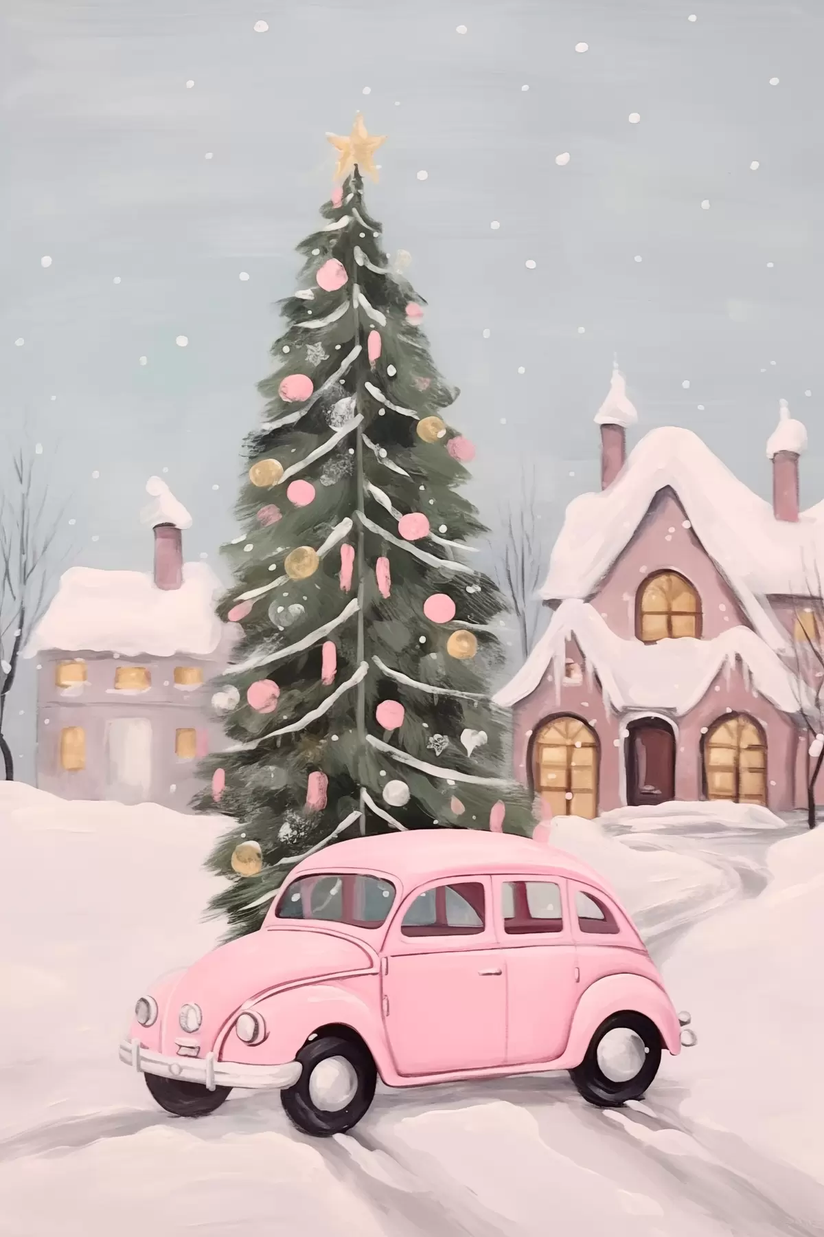 Affiche Voiture rose et sapin de Noël décoré devant la maison f46621