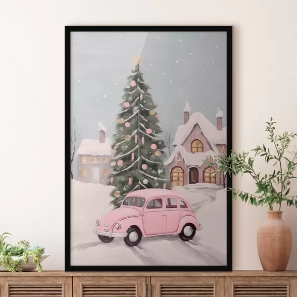 Affiche Voiture rose et sapin de Noël décoré devant la maison Non f46621