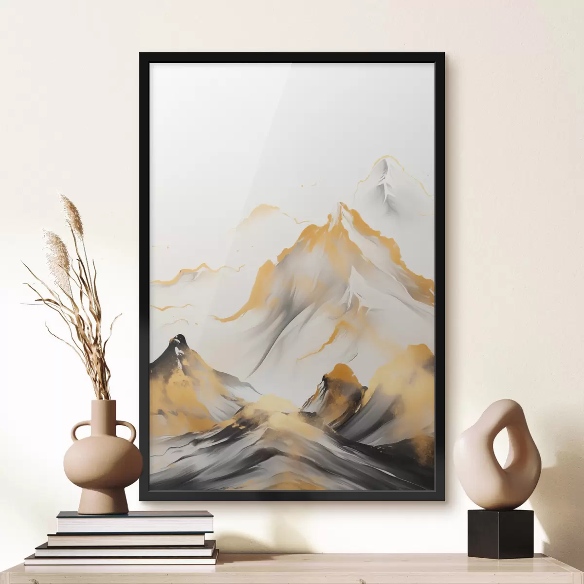 Affiche Montagnes texturées jaunes et noires aux sommets enneigés, style peinture à l'encre, chaîne de montagnes minimaliste Non f46683
