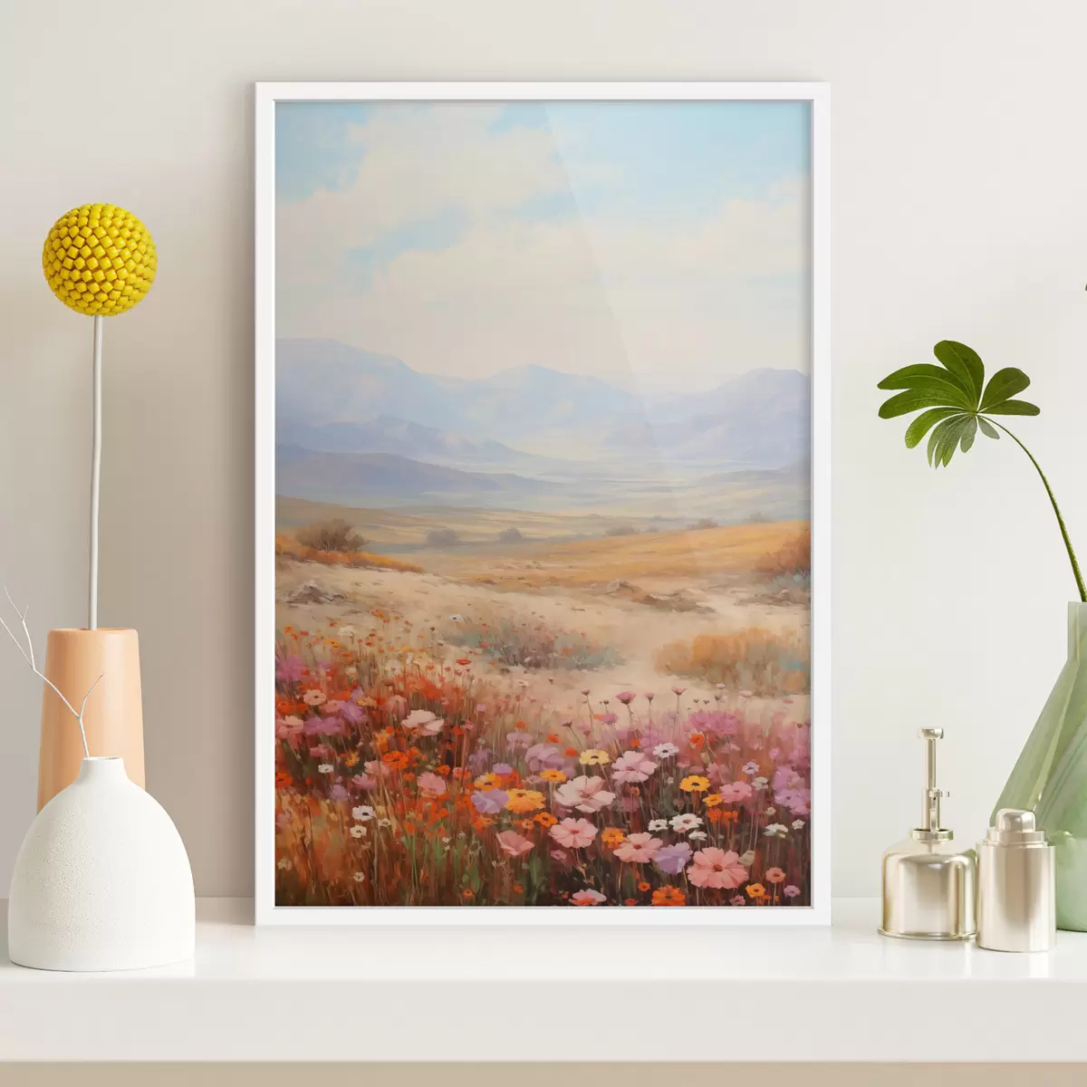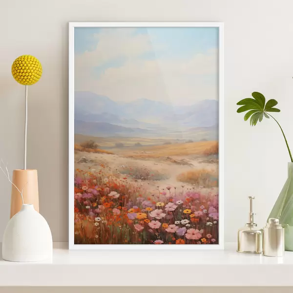 Affiche Paysage, champ de fleurs colorées avec des montagnes en arrière-plan, couleurs douces et pastel Non f46685