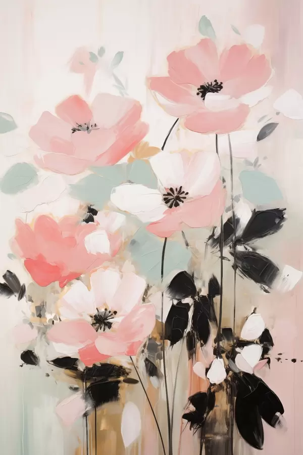 Affiche Fleurs roses et noires avec des feuilles, couleurs pastel douces, composition florale abstraite, art minimaliste Non f46688
