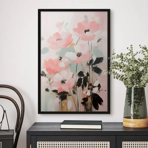 Affiche Fleurs roses et noires avec des feuilles, couleurs pastel douces, composition florale abstraite, art minimaliste f46688