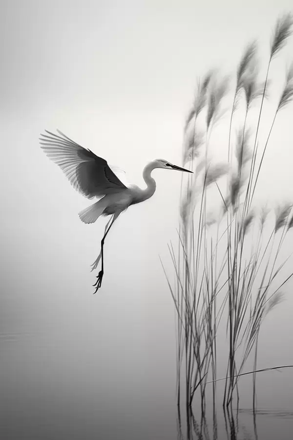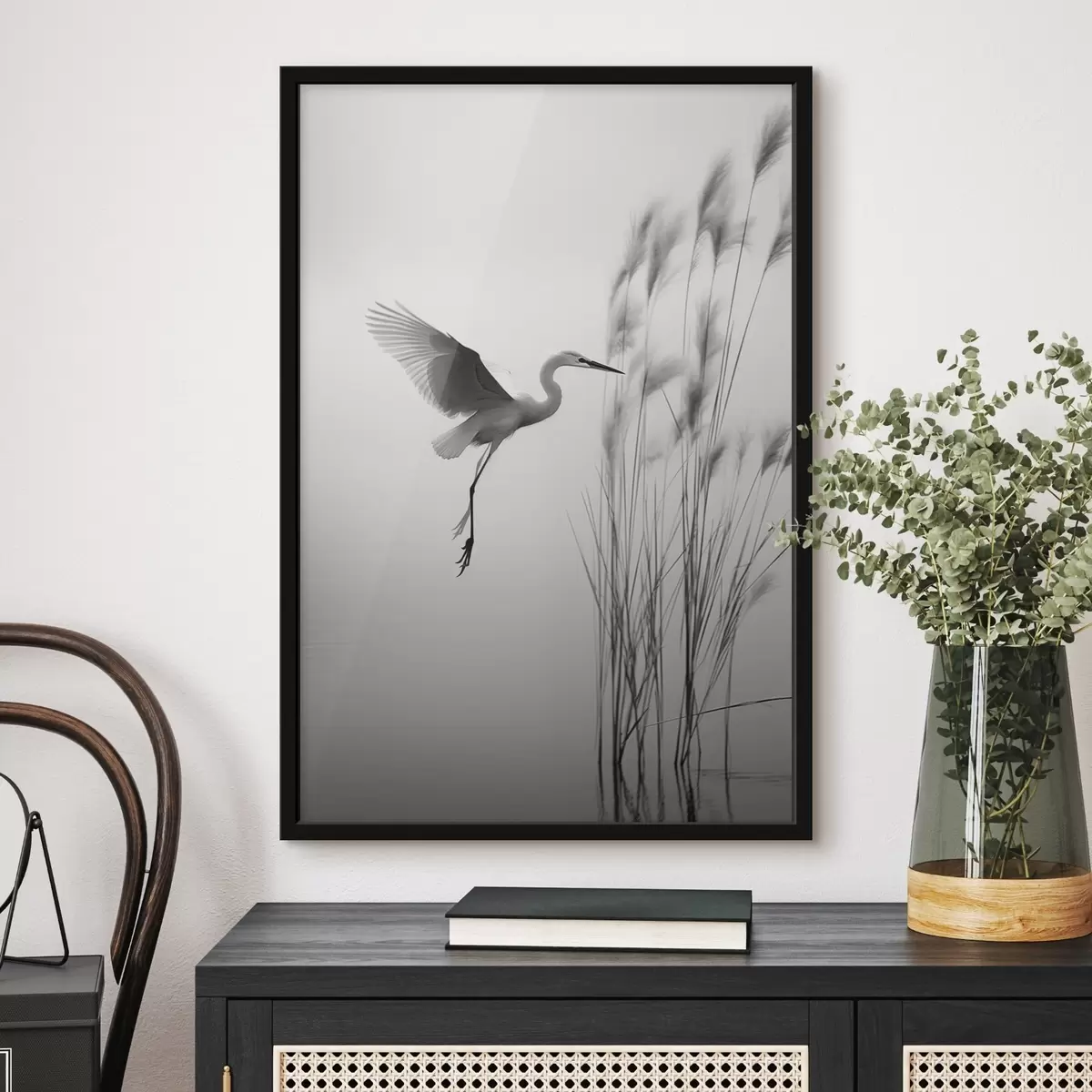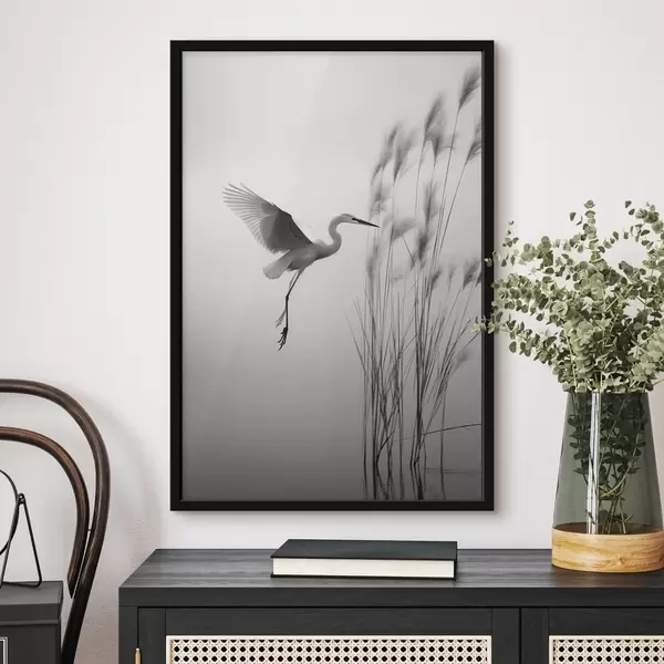 Affiche Un héron blanc aux ailes déployées, volant près de grands roseaux, composition minimaliste en noir et blanc f46693