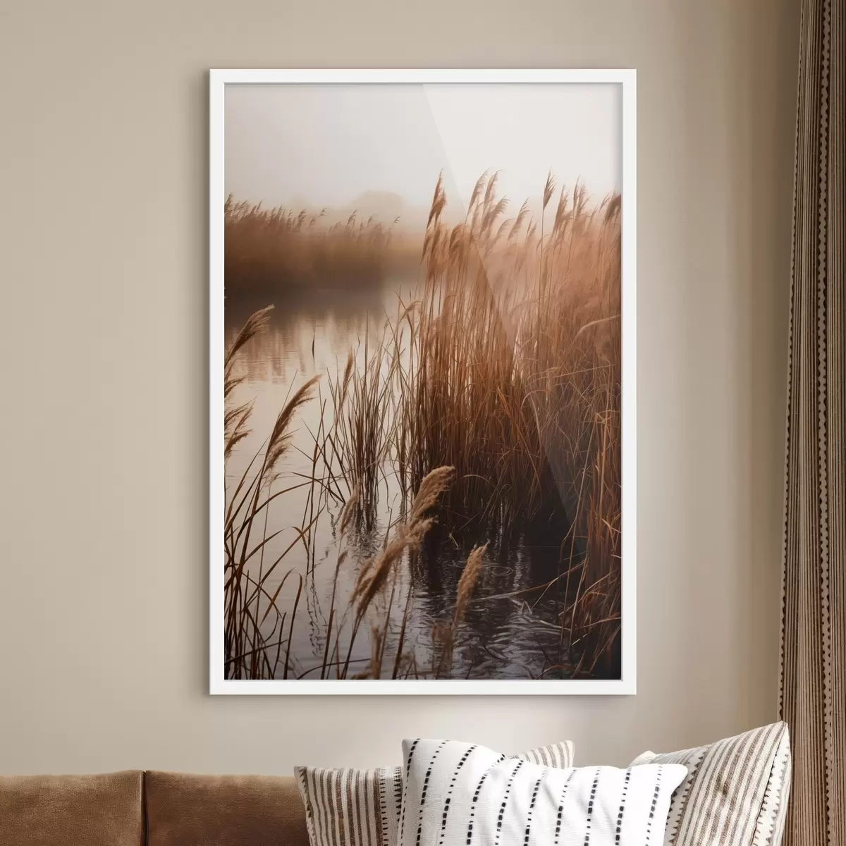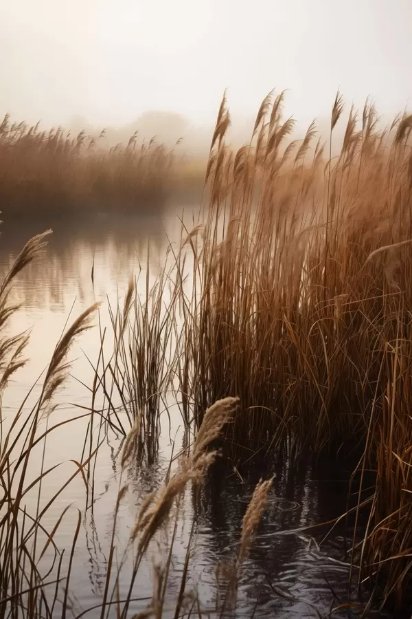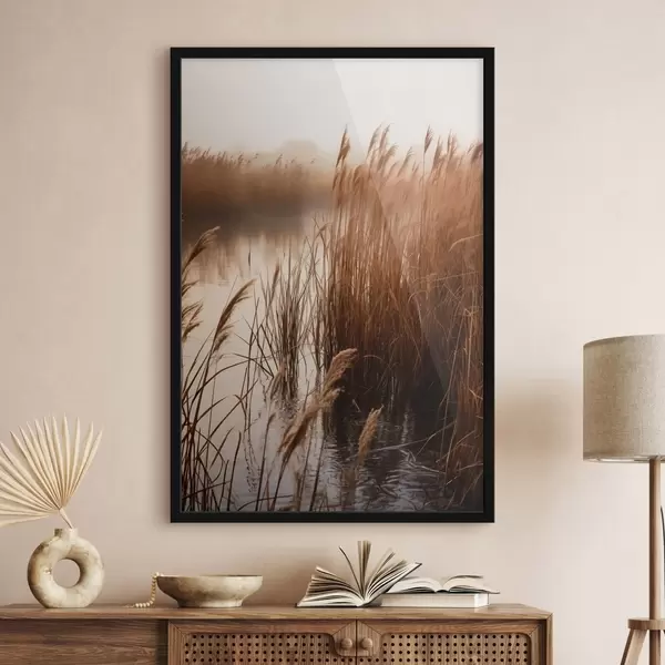Affiche De grands roseaux poussant dans un plan d'eau, l'eau reflète les roseaux, arrière-plan brumeux, lumière douce, scène naturelle f46695