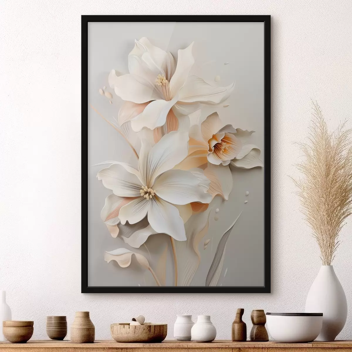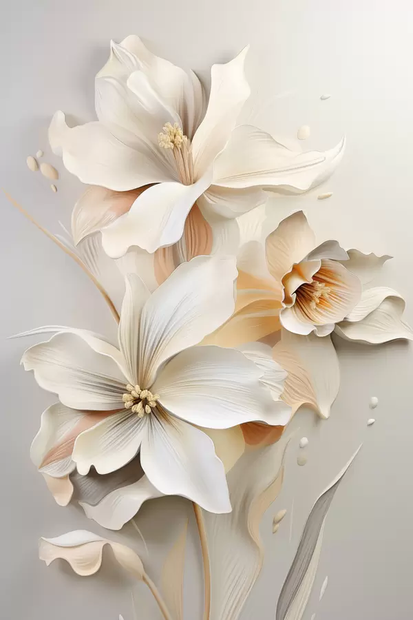 Affiche Fleurs blanches, pétales aux ombres douces, fond beige clair, composition élégante, style minimaliste Non f46699