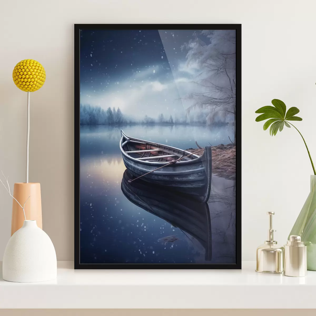 Affiche Bateau vide au bord d'un lac en hiver f46773