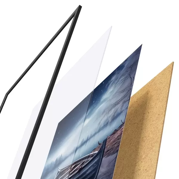 Le poster se compose d'un cadre, d'un plexiglas, d'une image imprimée et d'un support en aggloméré. Le poster peut être immédiatement accroché au mur grâce aux fixations au dos.
