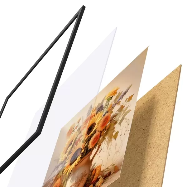 Le poster se compose d'un cadre, d'un plexiglas, d'une image imprimée et d'un support en aggloméré. Le poster peut être immédiatement accroché au mur grâce aux fixations au dos.
