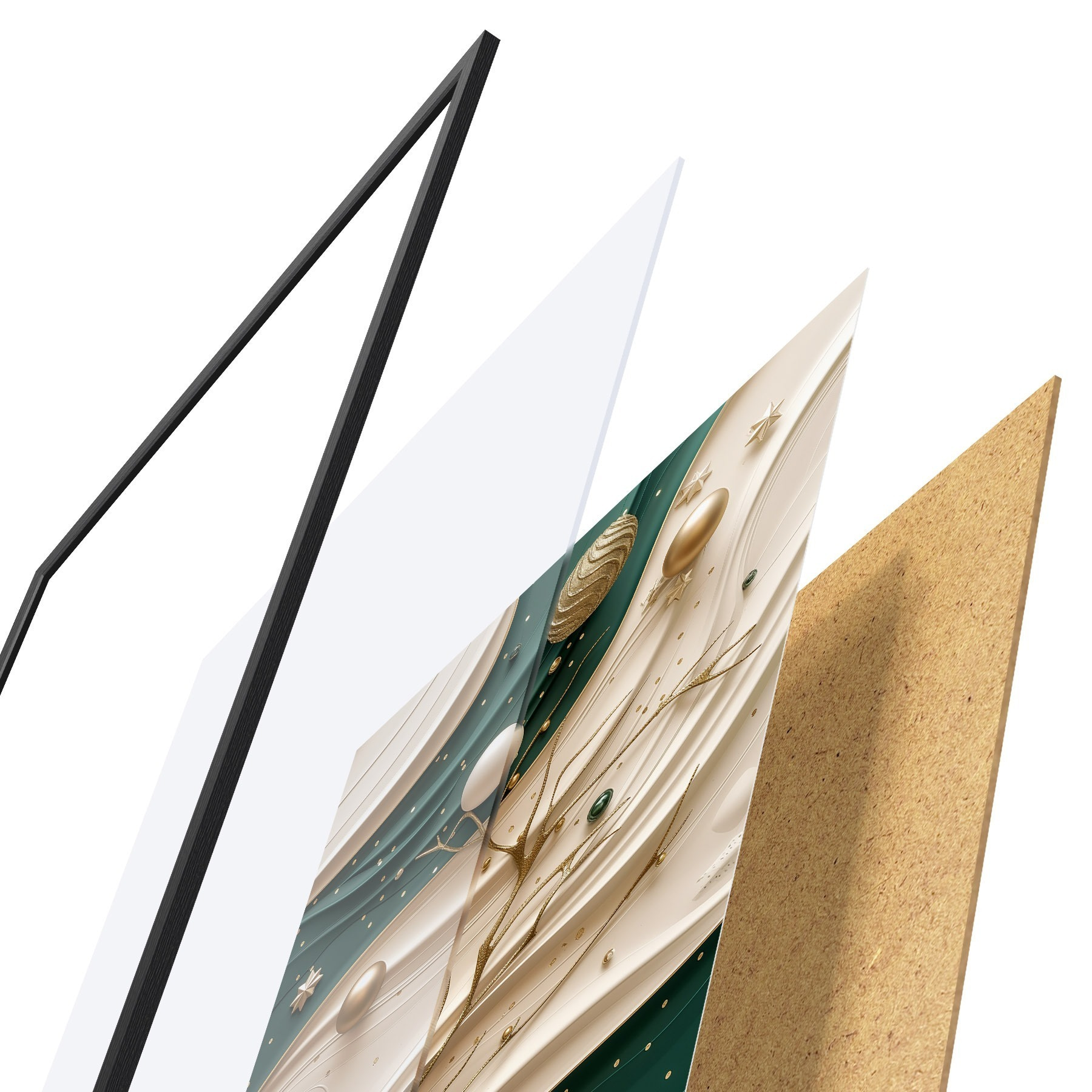Le poster se compose d'un cadre, d'un plexiglas, d'une image imprimée et d'un support en aggloméré. Le poster peut être immédiatement accroché au mur grâce aux fixations au dos.