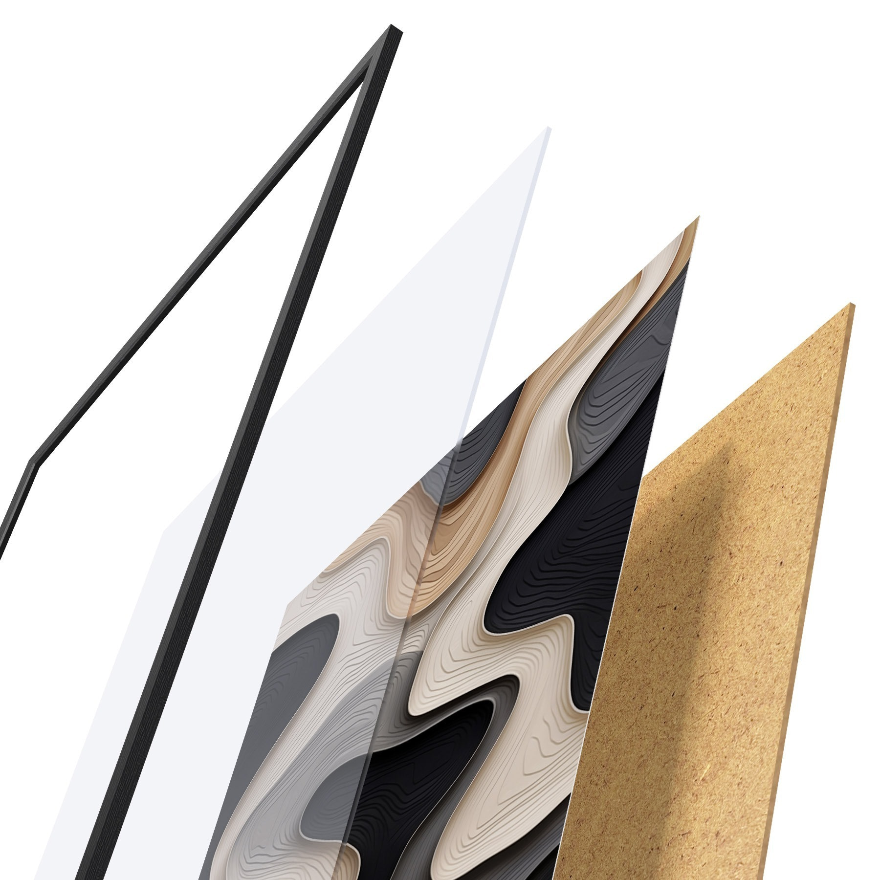 Le poster se compose d'un cadre, d'un plexiglas, d'une image imprimée et d'un support en aggloméré. Le poster peut être immédiatement accroché au mur grâce aux fixations au dos.