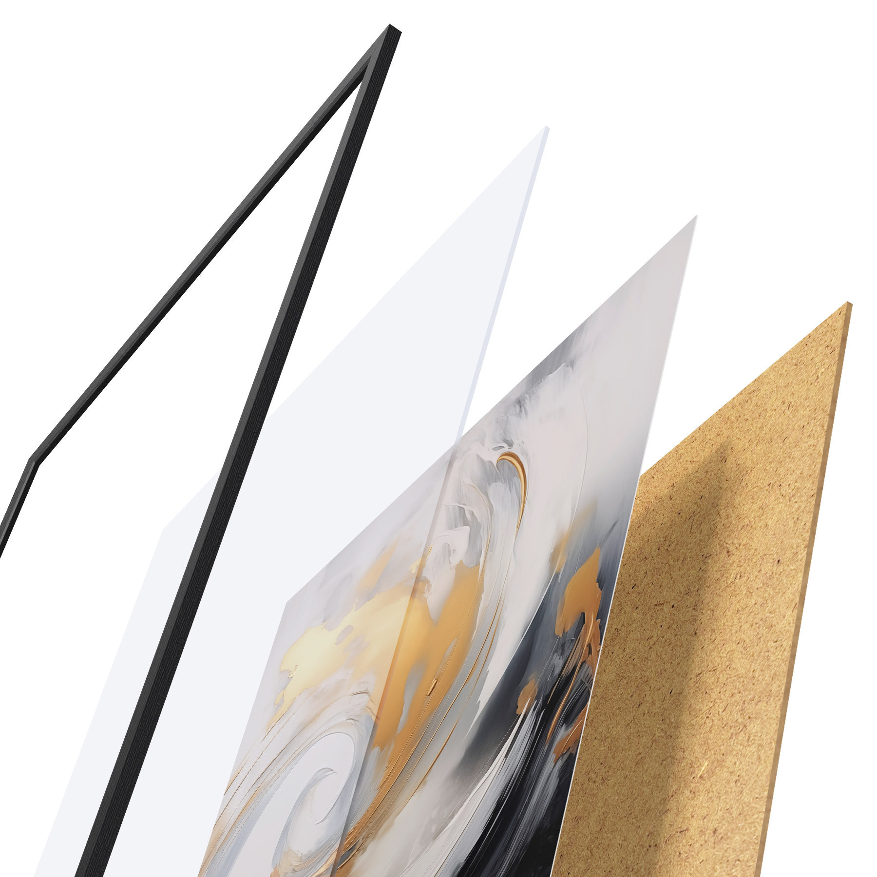 Le poster se compose d'un cadre, d'un plexiglas, d'une image imprimée et d'un support en aggloméré. Le poster peut être immédiatement accroché au mur grâce aux fixations au dos.
