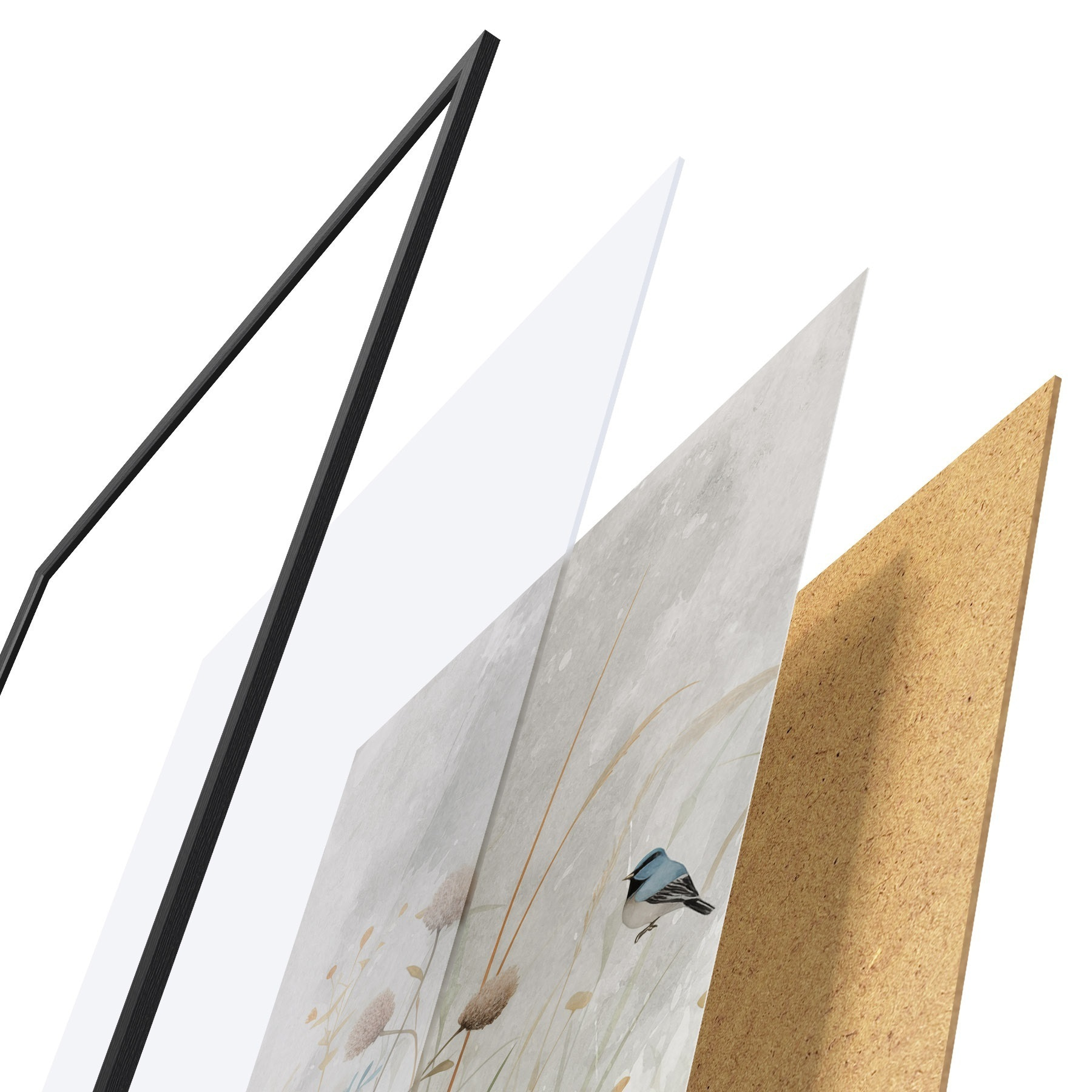 Le poster se compose d'un cadre, d'un plexiglas, d'une image imprimée et d'un support en aggloméré. Le poster peut être immédiatement accroché au mur grâce aux fixations au dos.
