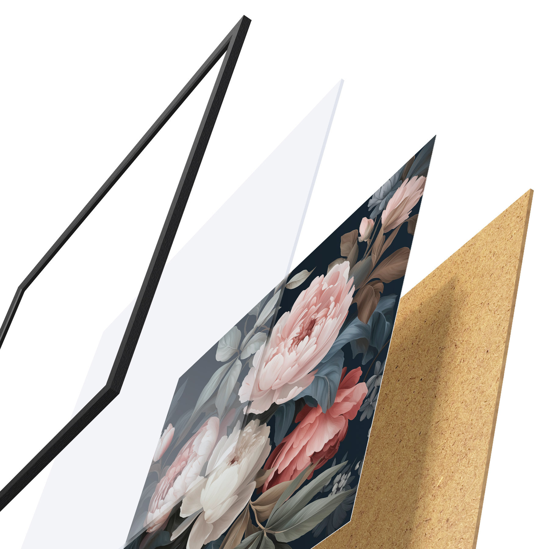 Le poster se compose d'un cadre, d'un plexiglas, d'une image imprimée et d'un support en aggloméré. Le poster peut être immédiatement accroché au mur grâce aux fixations au dos.