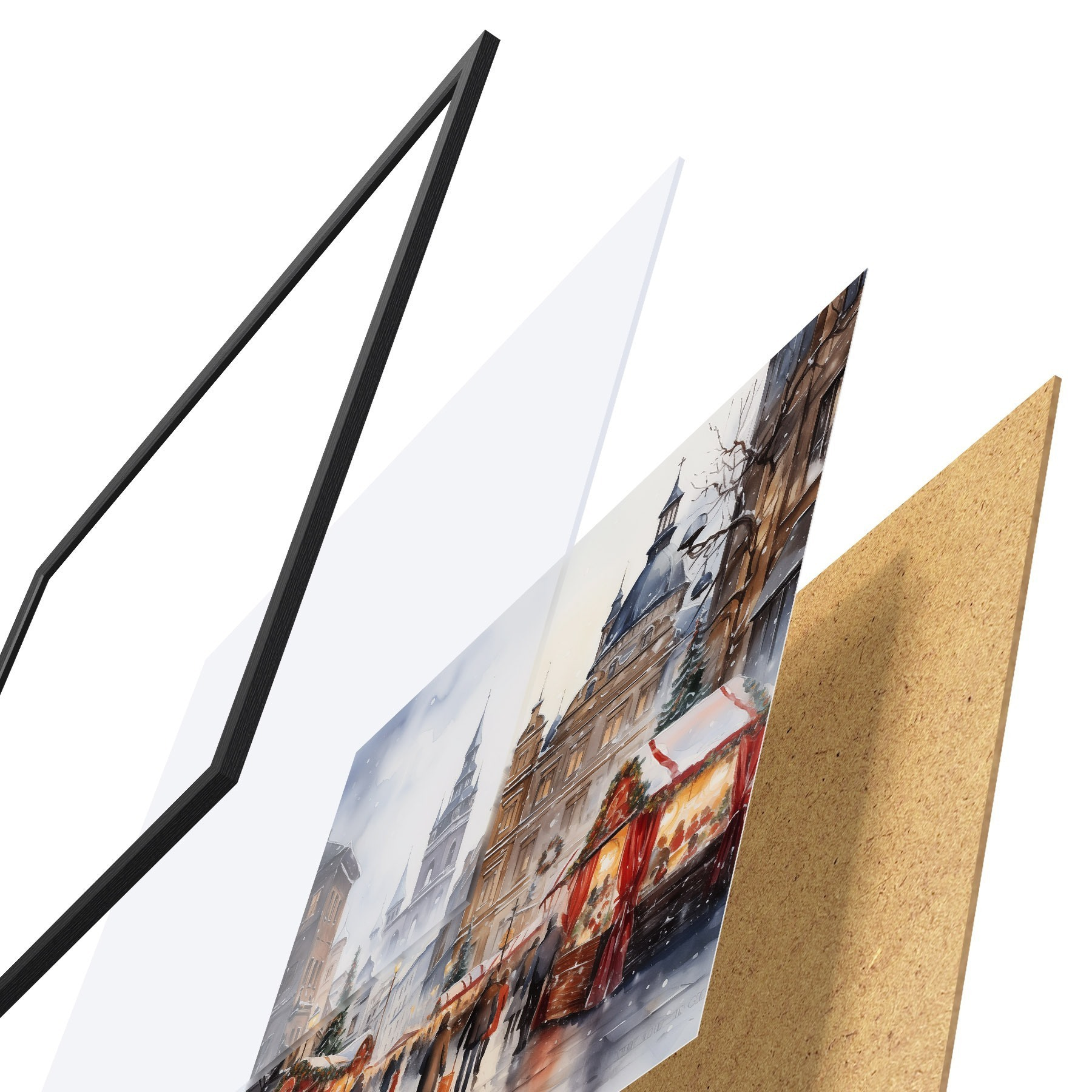 Le poster se compose d'un cadre, d'un plexiglas, d'une image imprimée et d'un support en aggloméré. Le poster peut être immédiatement accroché au mur grâce aux fixations au dos.