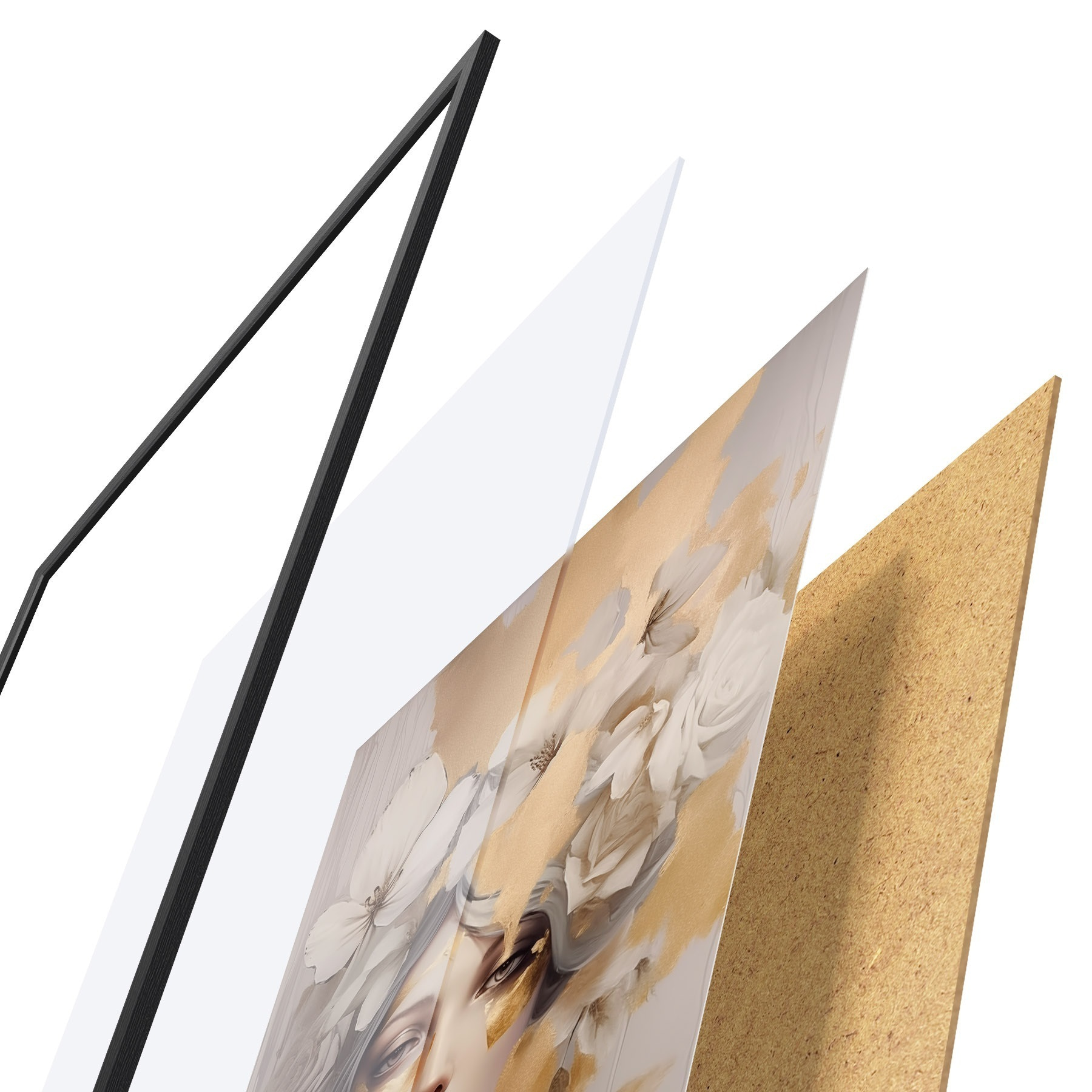 Le poster se compose d'un cadre, d'un plexiglas, d'une image imprimée et d'un support en aggloméré. Le poster peut être immédiatement accroché au mur grâce aux fixations au dos.